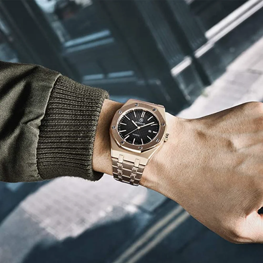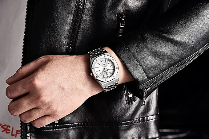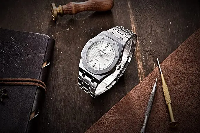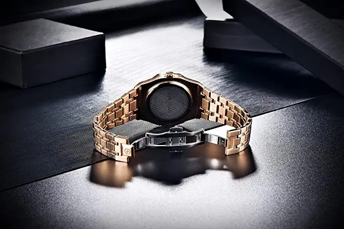 Very beautiful and qualitative watch. The small tool delivered with easily adjust the mesh of the bracelet. I highly recommend.