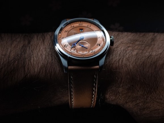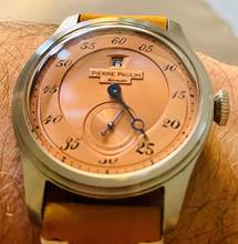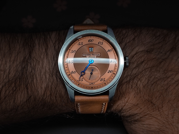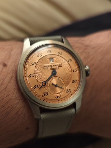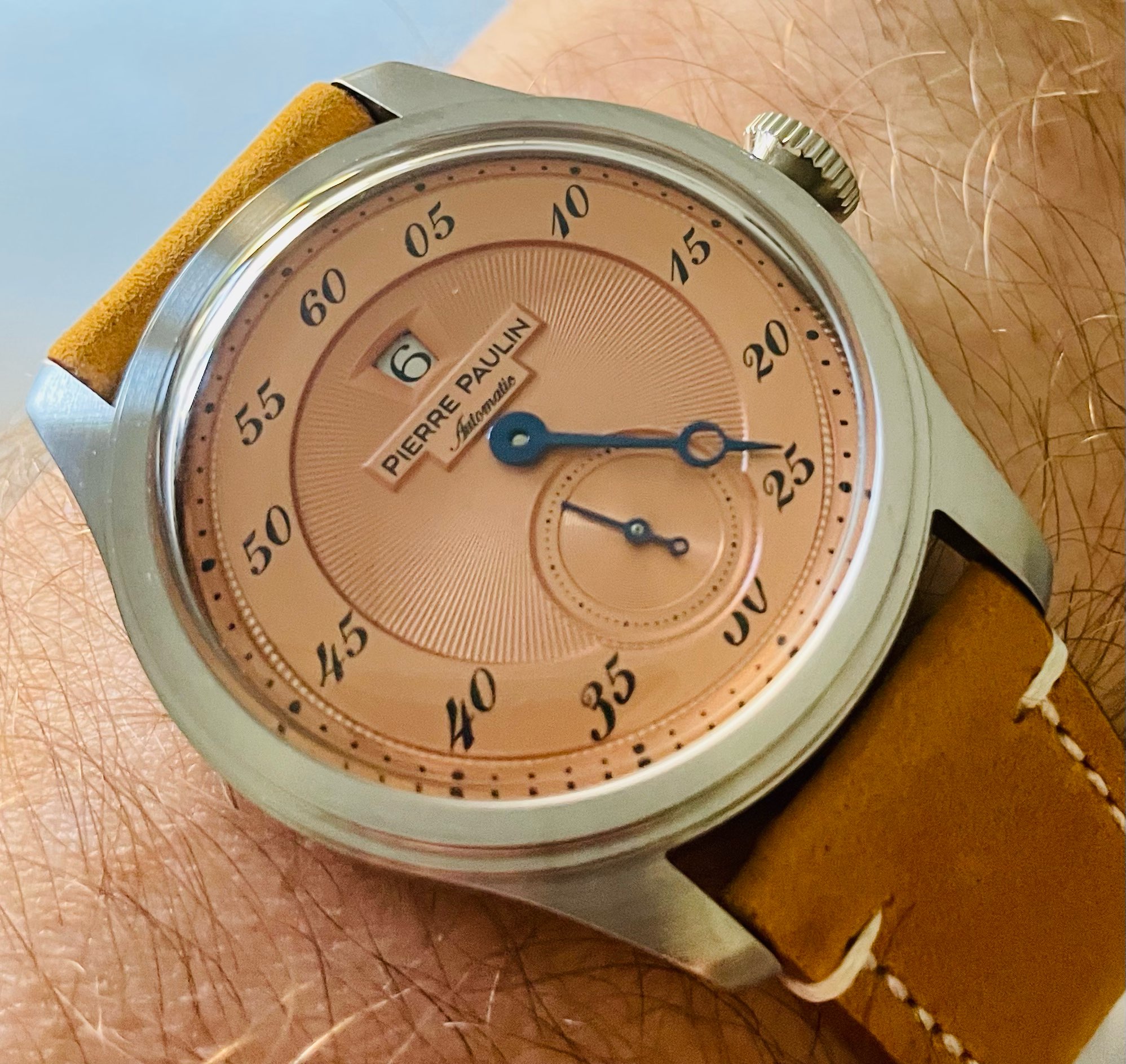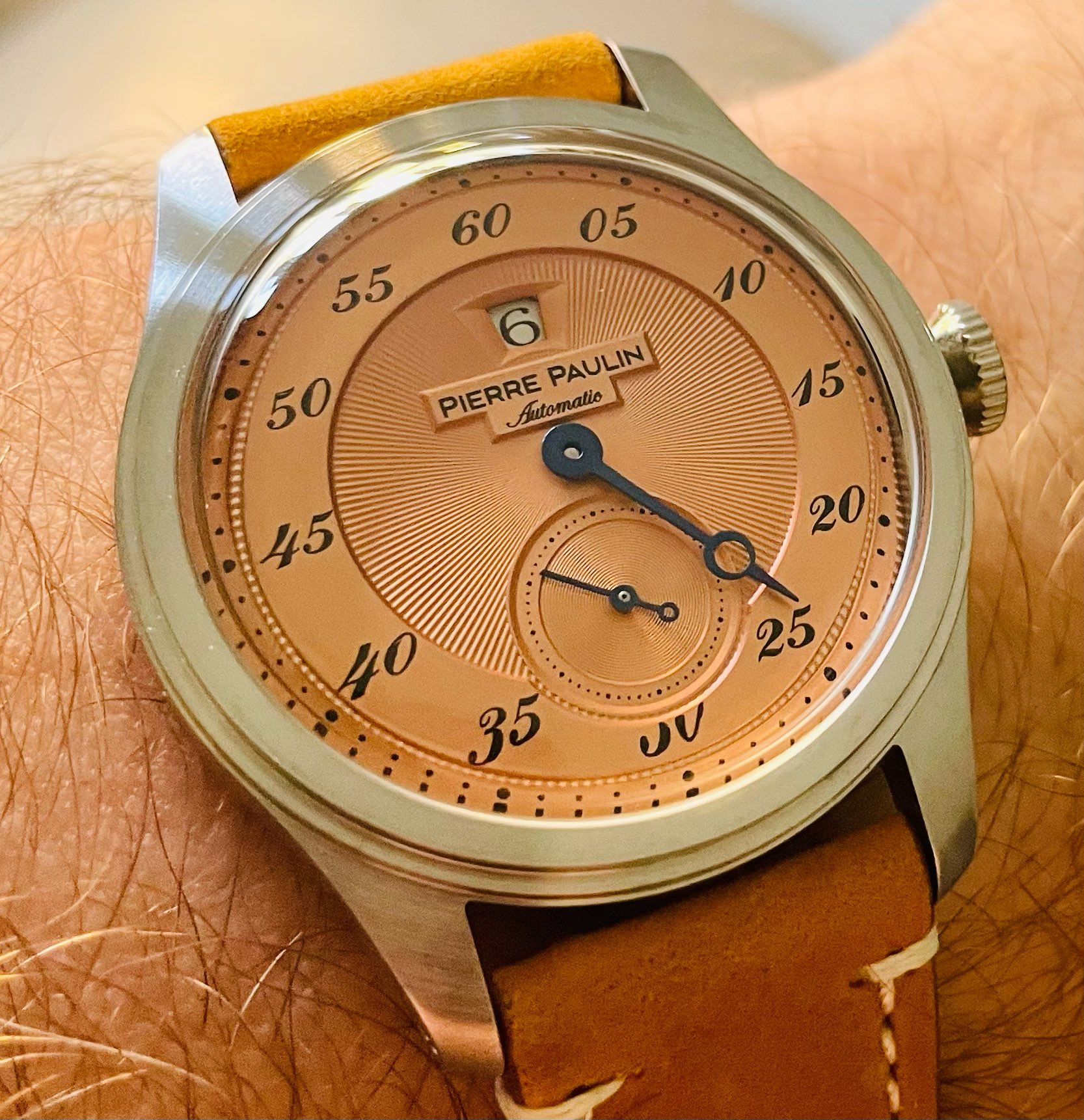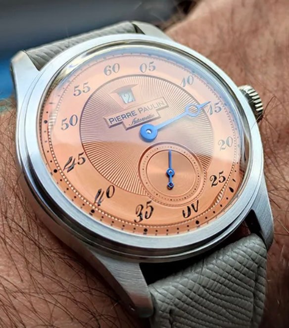 I’ve got a couple of Pierre Paulin dress watches now, and I find the 38mm cases very comfortable to wear. This ‘jumping hour’ salmon dial piece is no different ; and that rich deep salmon colour together with the textured centre section is one of the best looking I’ve worn to date - really really nice. Add the unusual hour complication with the blue hands and it’s a different option from the norm. Although the high box domed crystal is only mineral, it has such nice distortion on the outer section and edges it’s forgivable here, especially given the price. Putting a better quality strap on this watch lifts it again to another level. As affordable dress / vintage style watches go, this is the nicest since I bought my Second Hour Mandala salmon dial s couple of years ago - and that is 5 times the price. Well worth checking out…