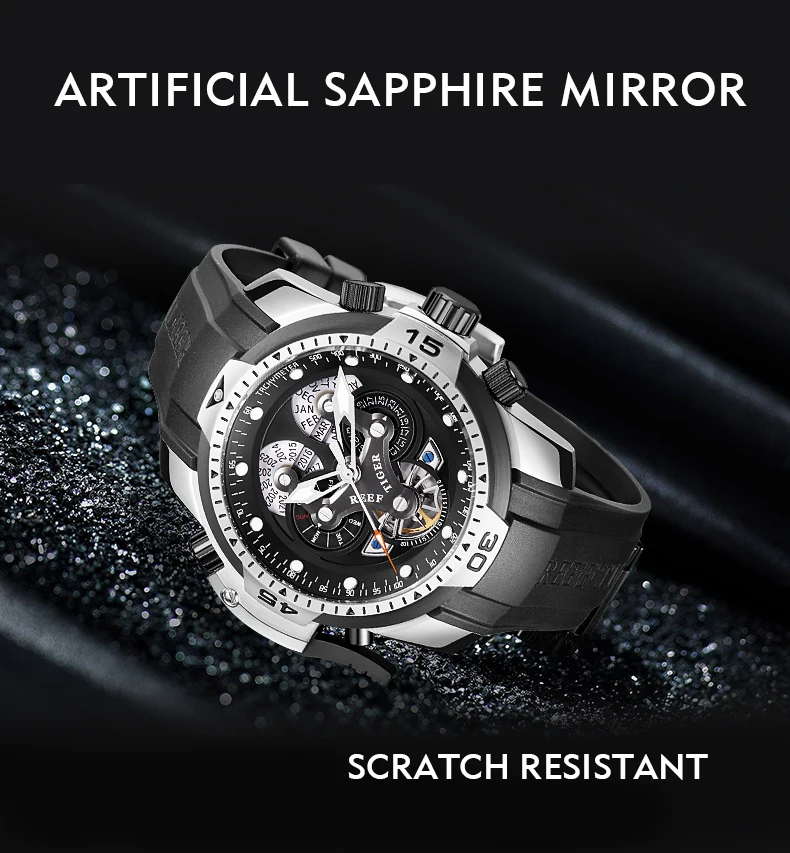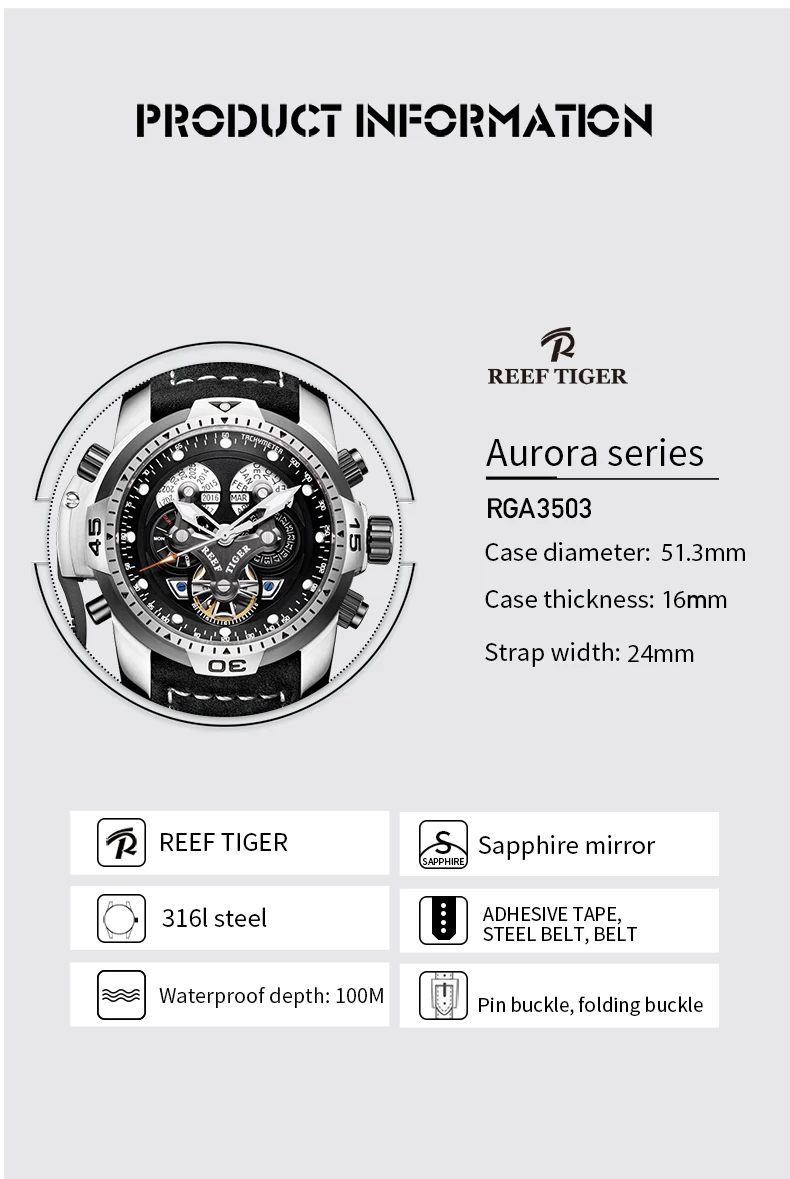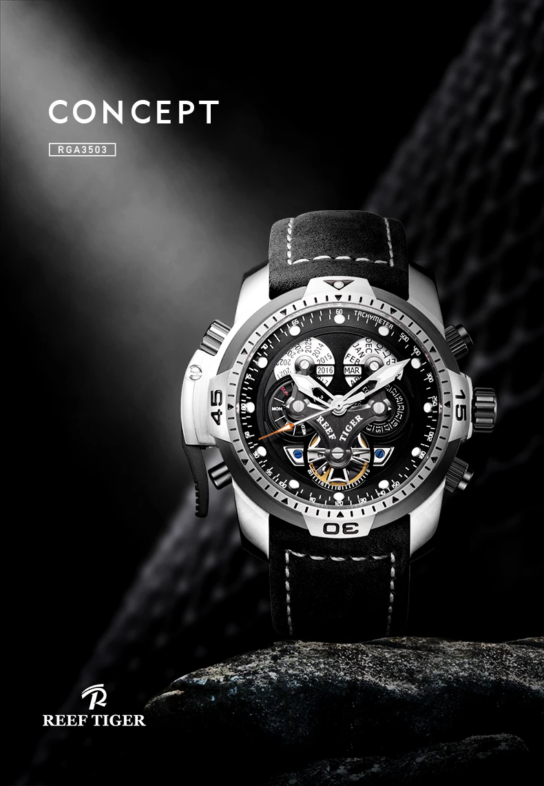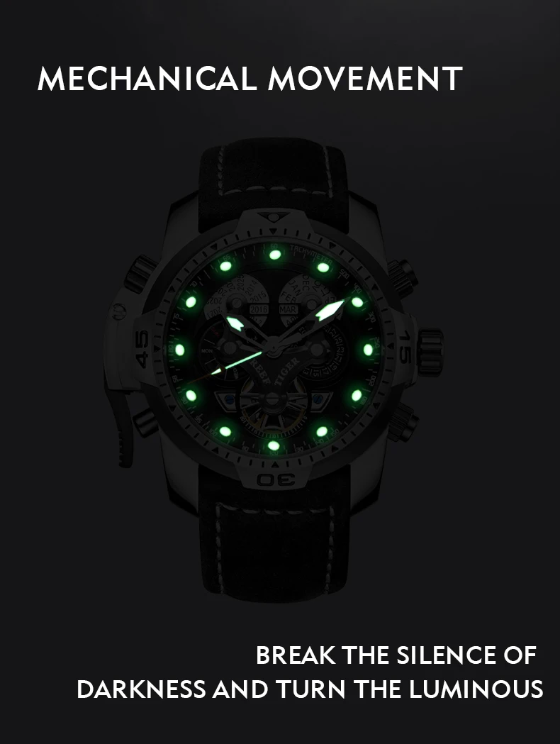 Reef Tiger Mens Automatic Watches Military Watch Mechanical Wristwatch Luminous Perpetual Calendar Steel Strap Sapphire RGA3503