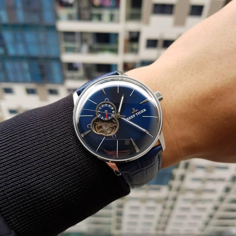 Reef Tiger/RT Luxury Brand Automatic Watch Men Genuine Leather Strap Designer Blue Watch Clock Relogio Masculino RGA8239
